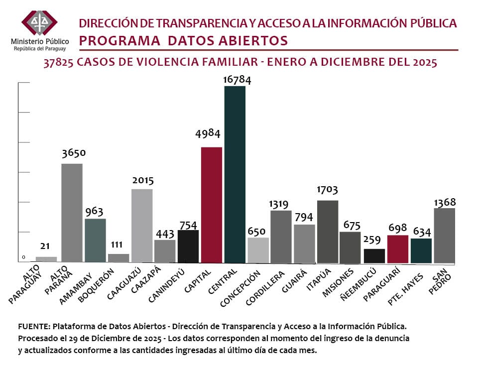 Los Datos Abiertos de la Dirección de Transparencia y Acceso a la Información del Ministerio Público observan un registro de 37825 víctimas de Violencia Familiar entre los meses de Enero a Diciembre del 2025.