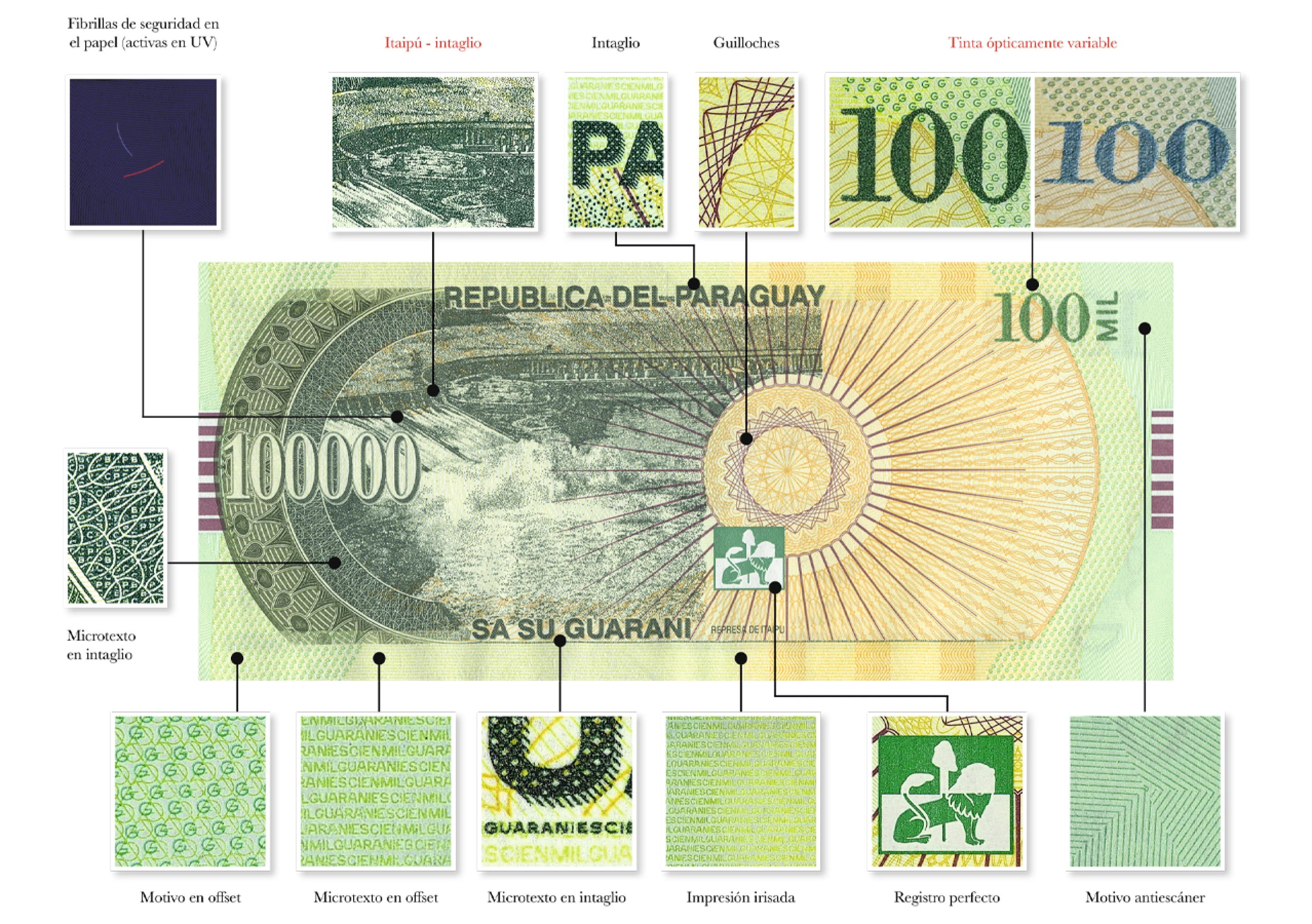 Impresión en relieve perceptible al tacto en el retrato y en la imagen de la represa Itaipú, ubicada en el anverso.