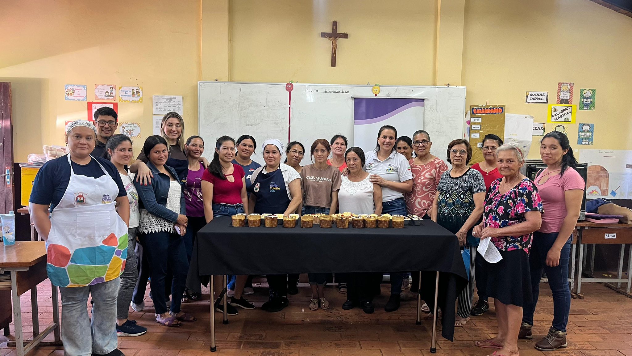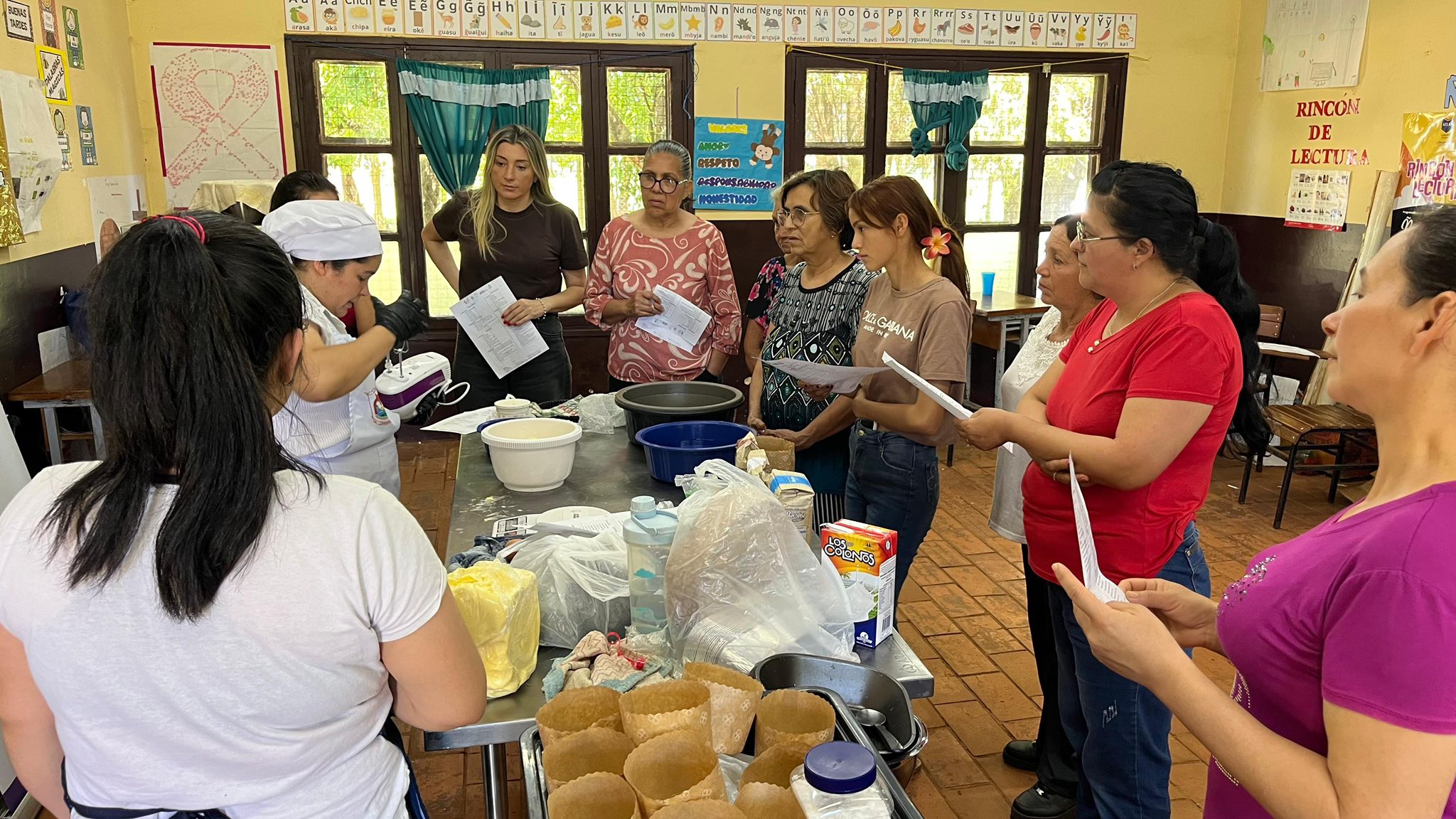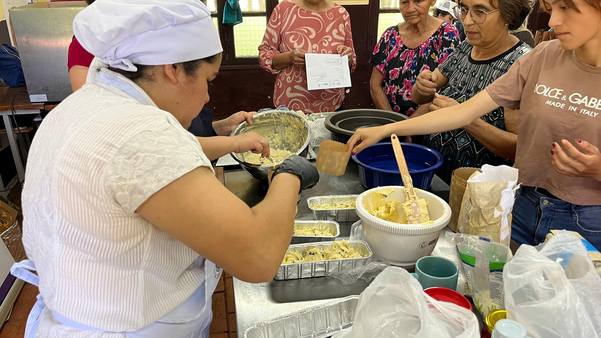 Mujeres del barrio Santo Domingo participaron de una jornada de capacitación gastronómica organizada por el Gobierno Departamental de Itapúa, donde aprendieron la elaboración de panes navideños en el predio de la Iglesia San Miguel.