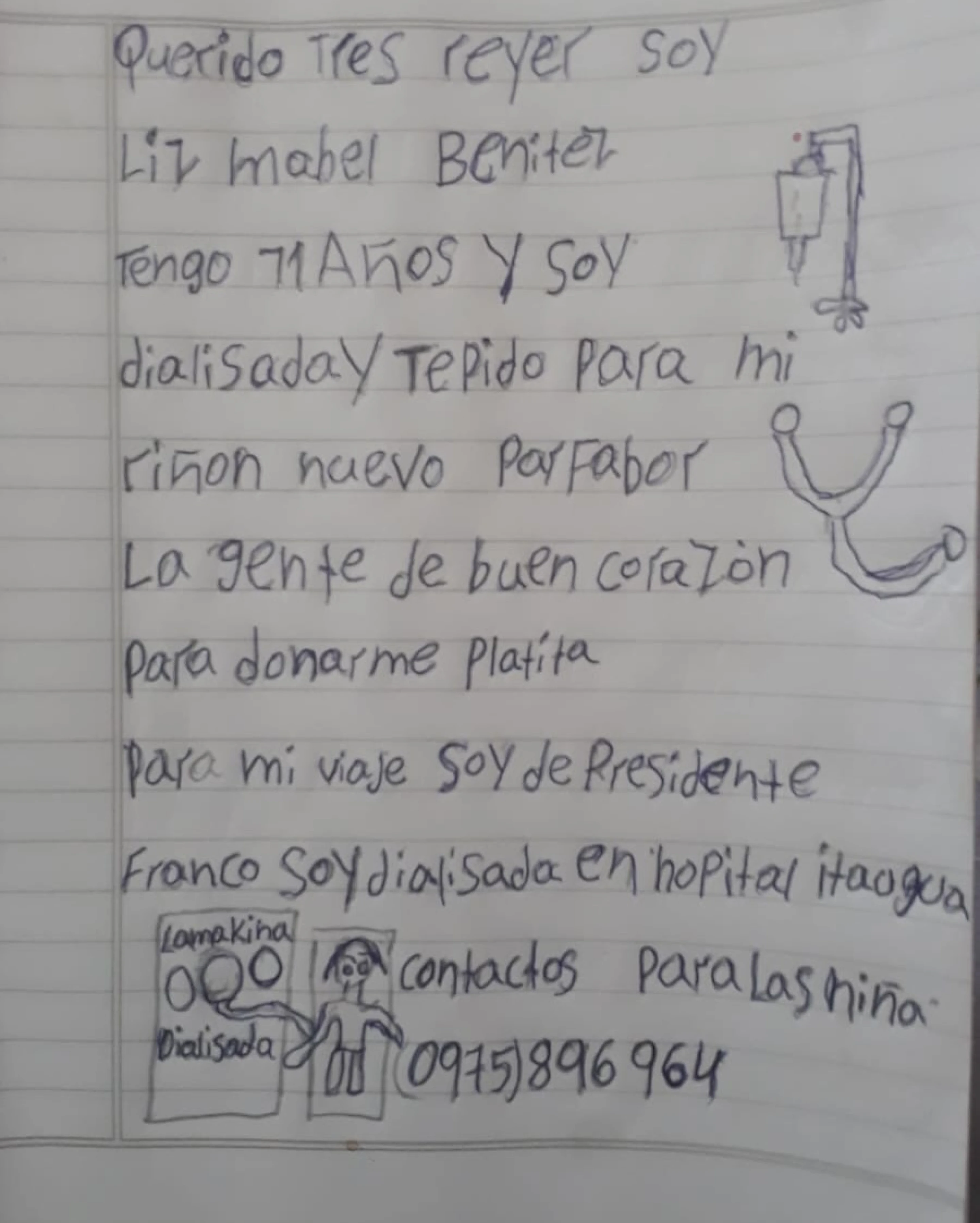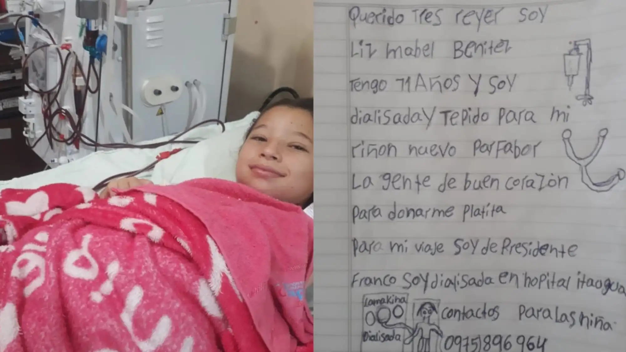 En su mensaje, Liz no pidió regalos costosos ni lujos, sino una oportunidad de vida. “Queridos Reyes, soy Liz Mabel Benítez, tengo 11 años y soy dializada y te pido para mi riñón nuevo, por favor”, escribió la niña en su carta. En el mismo texto también habló de la necesidad de juntar fondos para su tratamiento y para un eventual viaje, apelando a la solidaridad de la gente de buen corazón.