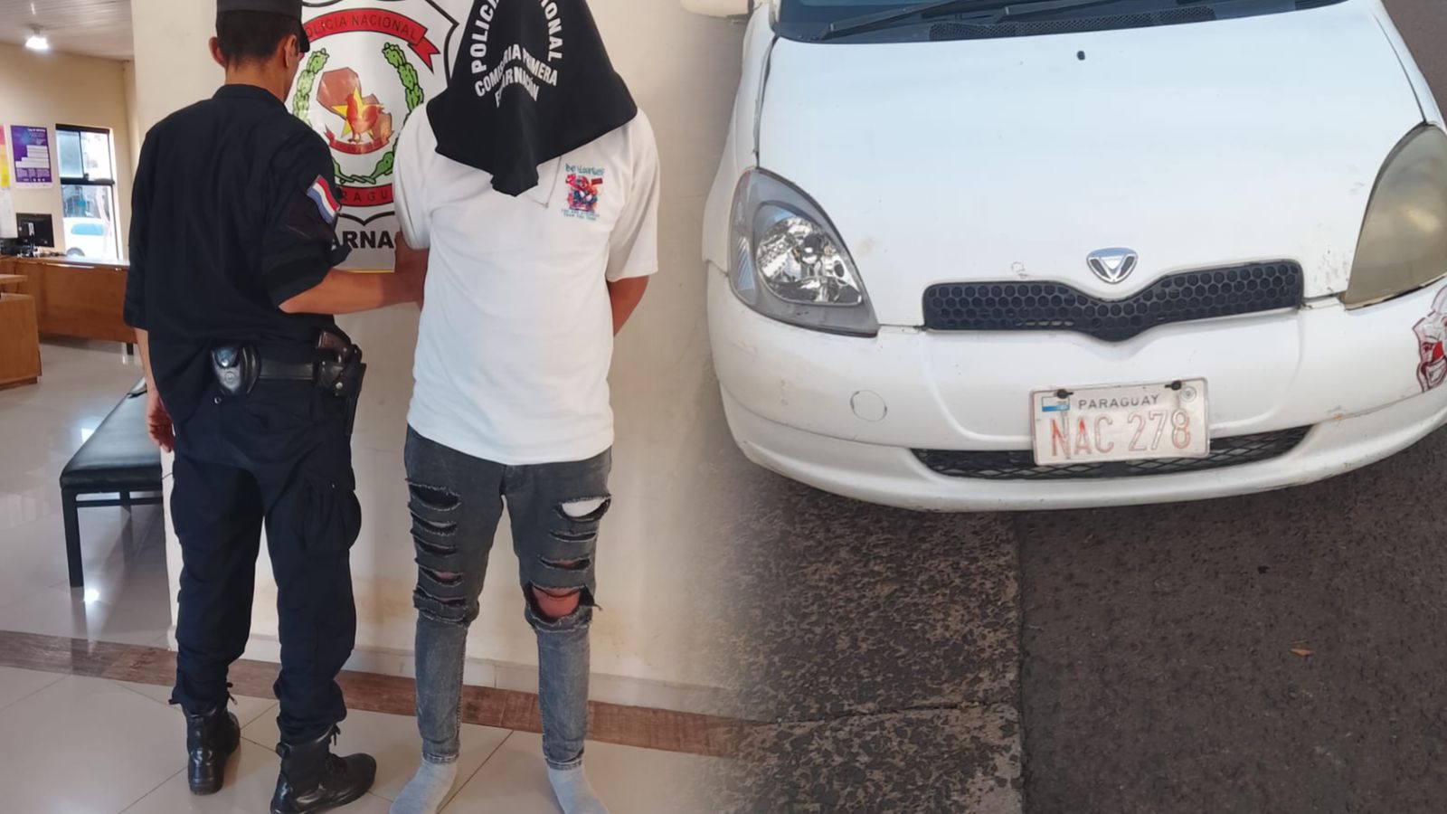 Tras una rápida acción, los intervinientes lograron interceptar el vehículo, un Toyota Vitz, color blanco, año 2000. Al momento de la verificación, el conductor fue identificado como Ever Adrián Morel Ramírez, domiciliado en el barrio Azotea del distrito de San Juan del Paraná.