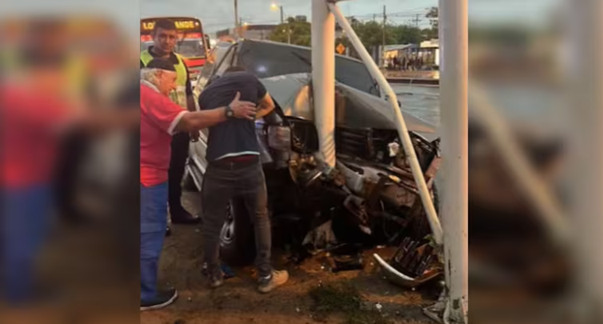 El vehículo salió del carril principal y acabó impactando contra la base de un cartel de señalización del MOPC ubicado sobre la ex Ruta Transchaco, provocando serios daños en la parte frontal del rodado.