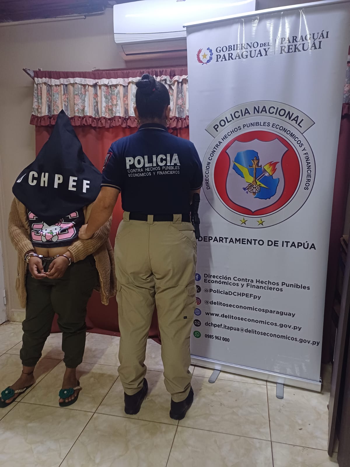 Tras recibir el aviso, los agentes del Departamento Contra Hechos Punibles se constituyeron de inmediato en el lugar, constatando la presencia de la sospechosa. Ante la irregularidad detectada y en prosecución a la denuncia existente, se procedió a la detención de Cintia Belén González Jaquet, de nacionalidad paraguaya y domiciliada en el Barrio Arroyo Porá de la ciudad de Cambyretá.
