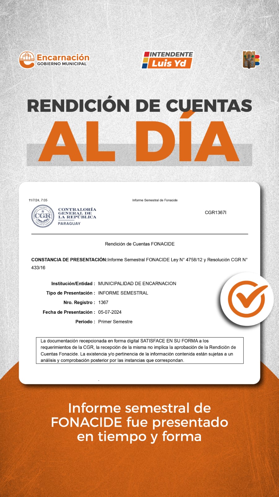 La Municipalidad de Encarnación presento el informe de la rendición de cuentas de los recursos utilizados en el FONACIDE, correspondiente al primer semestre del año 2024 a la Contraloría General de la República.