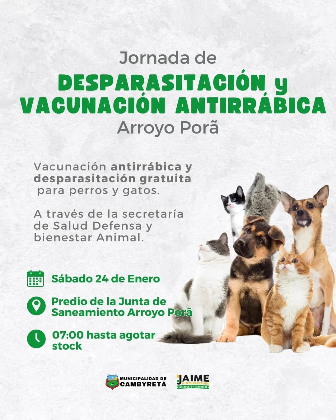 La Municipalidad de Cambyretá, a través de la Secretaría de Salud, Defensa y Bienestar Animal, realizará una jornada gratuita de desparasitación y vacunación antirrábica dirigida a perros y gatos.