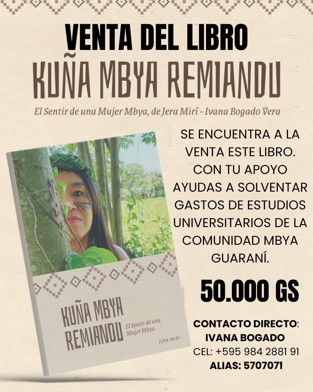 Para financiar los gastos de su titulación y continuar promoviendo la riqueza de su cultura, Ivana ha puesto a la venta su libro titulado "Kuña Mbya Rembiandu – El sentir de una mujer Mbya".