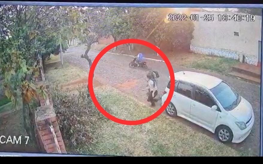 La afectada fue Fabiana María Belén Ocampos de 29 años, quien fue interceptada por delincuentes que estaban a bordo de una motocicleta y se observa en circuito cerrado que uno de los ocupantes descendió del biciclo y despojó a la mujer de un teléfono celular.
