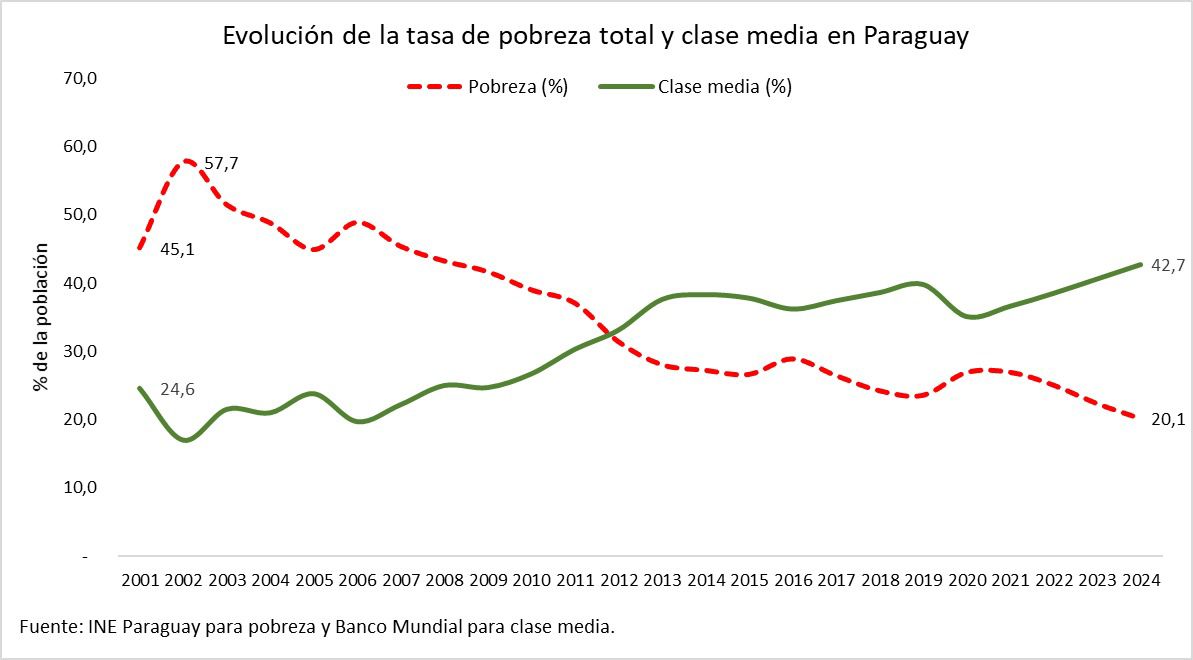 Paraguay muestra avances sostenidos en materia social y económica, de acuerdo con datos oficiales y organismos internacionales. La evolución de los indicadores revela una reducción significativa de la pobreza y, en paralelo, un crecimiento sostenido de la clase media en el país.