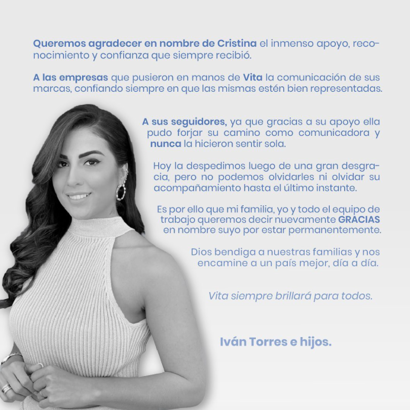 “Queremos agradecer en nombre de Cristina el inmenso apoyo, reconocimiento y confianza que siempre recibió”, destaca el mensaje. El mismo agradece además a las empresas que apostaron a su imagen “confiando siempre en que las mismas estén bien representadas”.