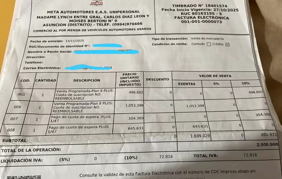 Las víctimas relatan que, tras realizar un pago inicial cercano a 2 millones de guaraníes con la promesa de poder retirar el vehículo, nunca recibieron el rodado y se encontraron con múltiples excusas por parte del concesionario, identificado como Meta Automotores.