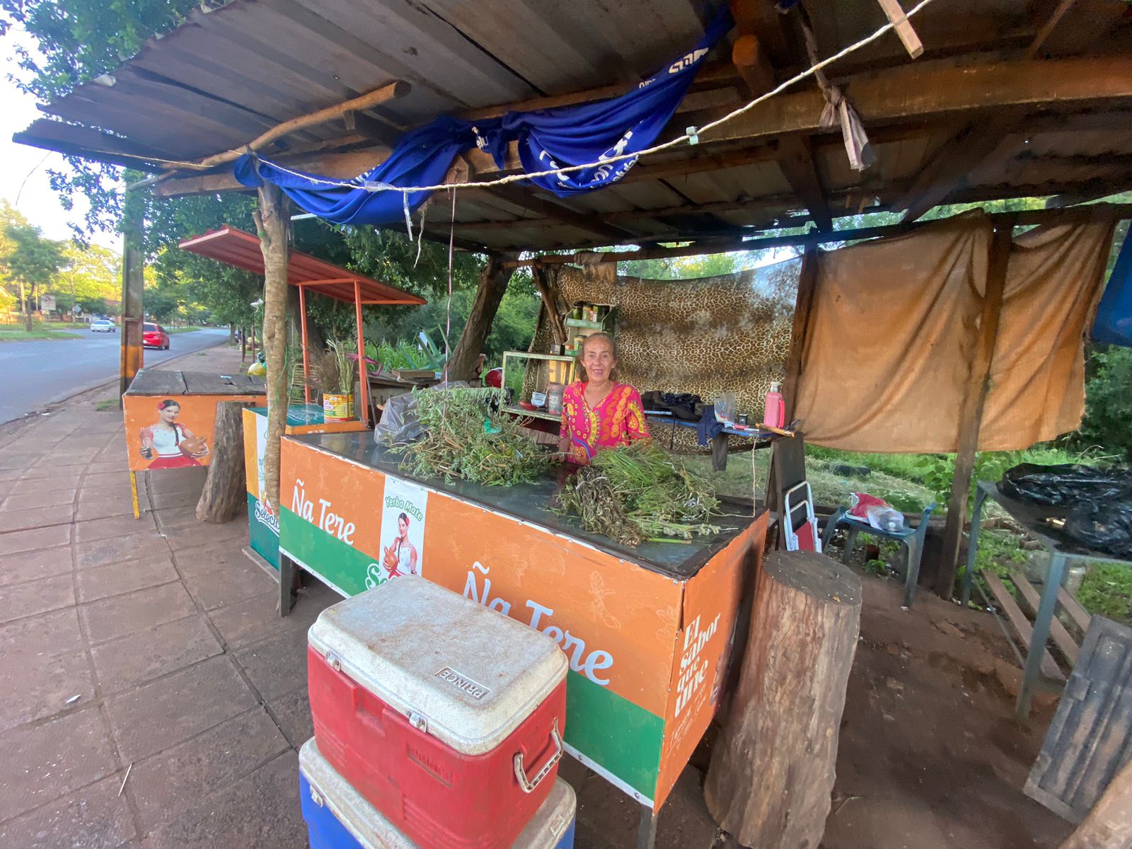 Doña Teresa cuenta con su puesto en las inmediaciones de la rotonda de la Entidad Binacional Yacyretá desde hace aproximadamente 15 años. A través de la venta de yuyos medicinales y la preparación de tereré, logró sacar adelante a sus hijos y construir una vida digna, basada en el esfuerzo diario y el trabajo honesto.