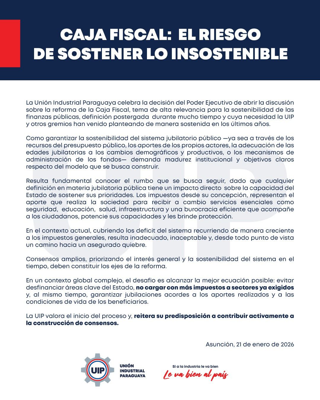 La Unión Industrial Paraguaya (UIP) celebró la decisión del Poder Ejecutivo de abrir la discusión sobre la reforma de la Caja Fiscal, un tema de alta relevancia para la sostenibilidad de las finanzas públicas y cuya definición ha sido postergada durante años, pese a los reiterados planteamientos realizados por el sector industrial y otros gremios.