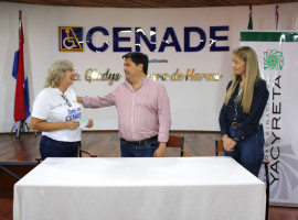 La entrega oficial del donativo estuvo a cargo del Director Ejecutivo Paraguayo de la EBY, Lic. Luis Benítez Cuevas, y fue recibida por la Sra. Mirtha Wasmuth, representante del CENADE.